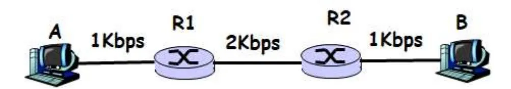 The bottleneck is the link with the minimum bandwidth. Here, both A→R1 and R2→B have 1 Kbps, while R1→R2 has 2 Kbps. So the bottleneck is 1 Kbps.