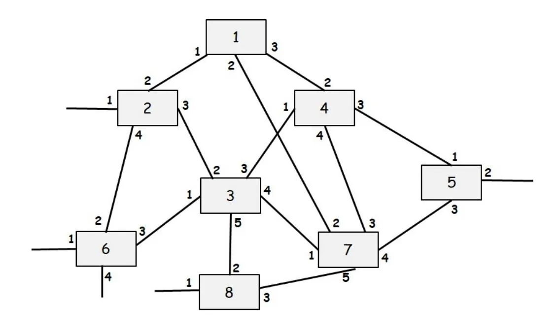 Consider the following LAN consisting of 8 bridges numbered 1-8 with the given connections. Each interface of each bridge is also labeled starting with 1. Run Perlman’s Spanning Tree Algorithm and for each interface of each bridge write down whether the interface is a “Root port (R)”, a “Designated port (D)” or “Blocking Port (B)” in the tables given below. Finally, show the final spanning tree.